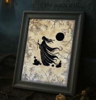 Model stitched on: 30 count Dark Spell BIG linen by The Primitive Hare using DMC threads